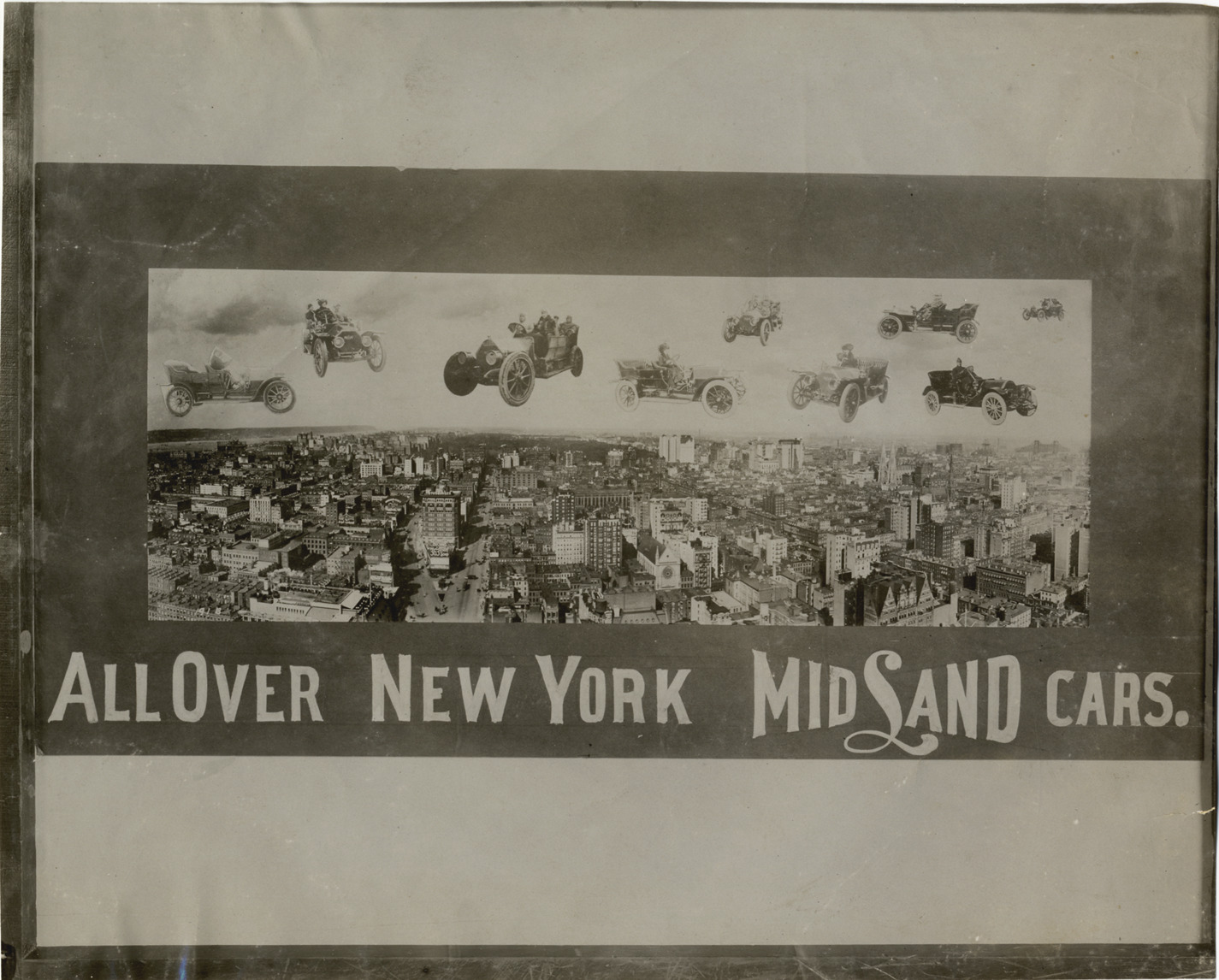View of advertisement for 1910 Midland cars tacked on wall. Ad depicts motorists in Midland cars suspended over bird's-eye view of New York City with text: "All over New York, Midland cars." Stamped on back: "Spooner & Wells, Inc., photographers, telephones 3472-3473 Columbus, 1931 Broadway, New York." Handwritten on back: "Midland, 1910."