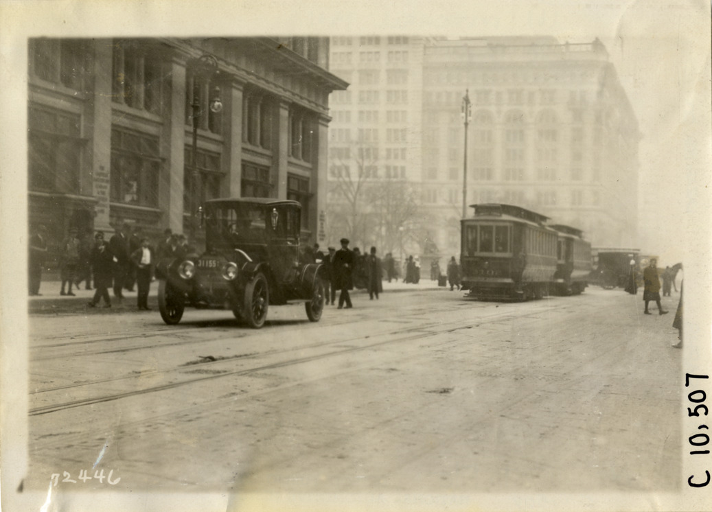 View of 1911 Mitchell car, parked in front of the Garfield National Bank and Garfield Safe Deposit Company building in New York City. Pedestrians, streetcars and Metropolitan Life Insurance Company building in background. Handwritten on back: "Mitchell, 1911."