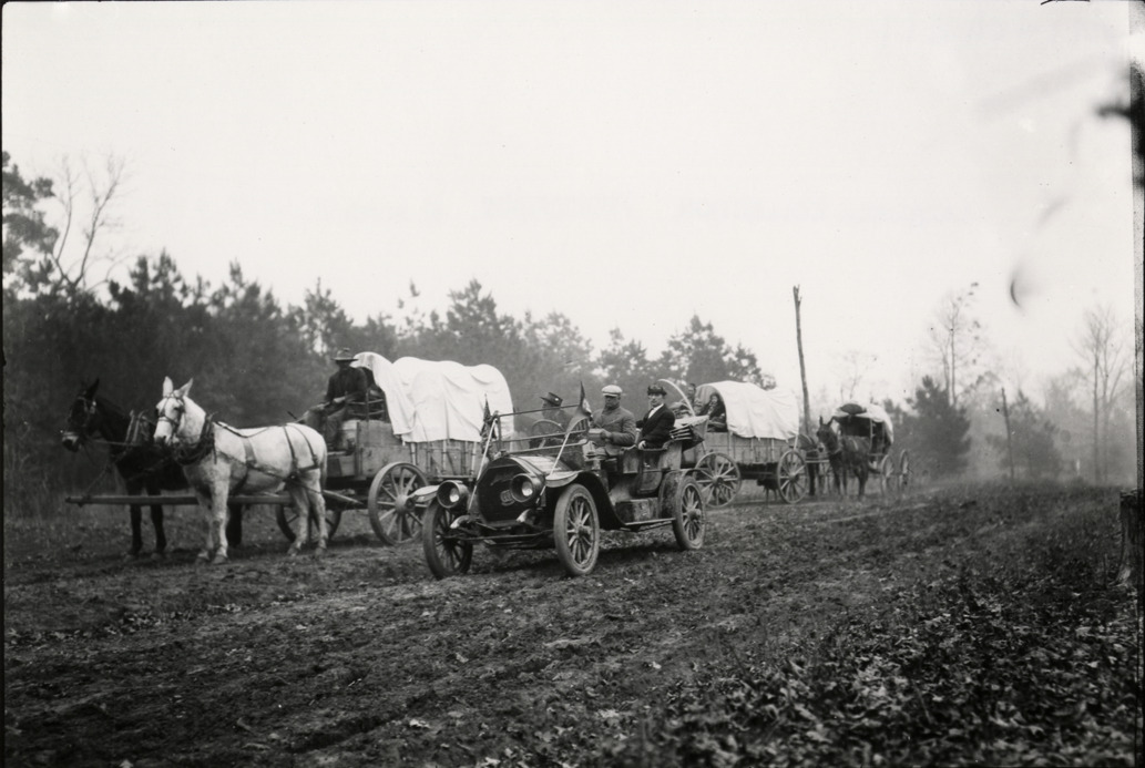 Motorists in 1910 Mitchell automobile, traveling next to covered wagons