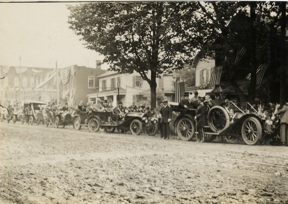 View of cars lined up for parade during festivities surrounding the 1910 dedication of the Custer equestrian monument in Monroe, Michigan. Stamped on back: "Spooner & Wells, Inc., photographers, telephone North 1745. 1231 Woodward Ave., Detroit, Mich. Detroit, 1231 Woodward, New York, 1931 Broadway." Handwritten on back: "Monuments--Custer memorial celebration, 1910."