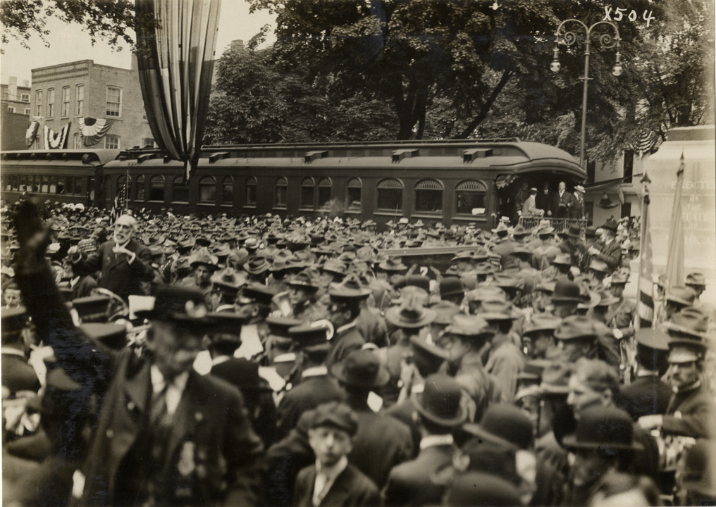 View of President Taft on rear platform of railroad car during festivities surrounding the 1910 dedication of the Custer equestrian monument in Monroe, Michigan. Stamped on back: "Spooner & Wells, Inc., photographers, telephone North 1745. 1231 Woodward Ave., Detroit, Mich. Detroit, 1231 Woodward, New York, 1931 Broadway." Handwritten on back: "Monuments--Custer memorial celebration, 1910."
