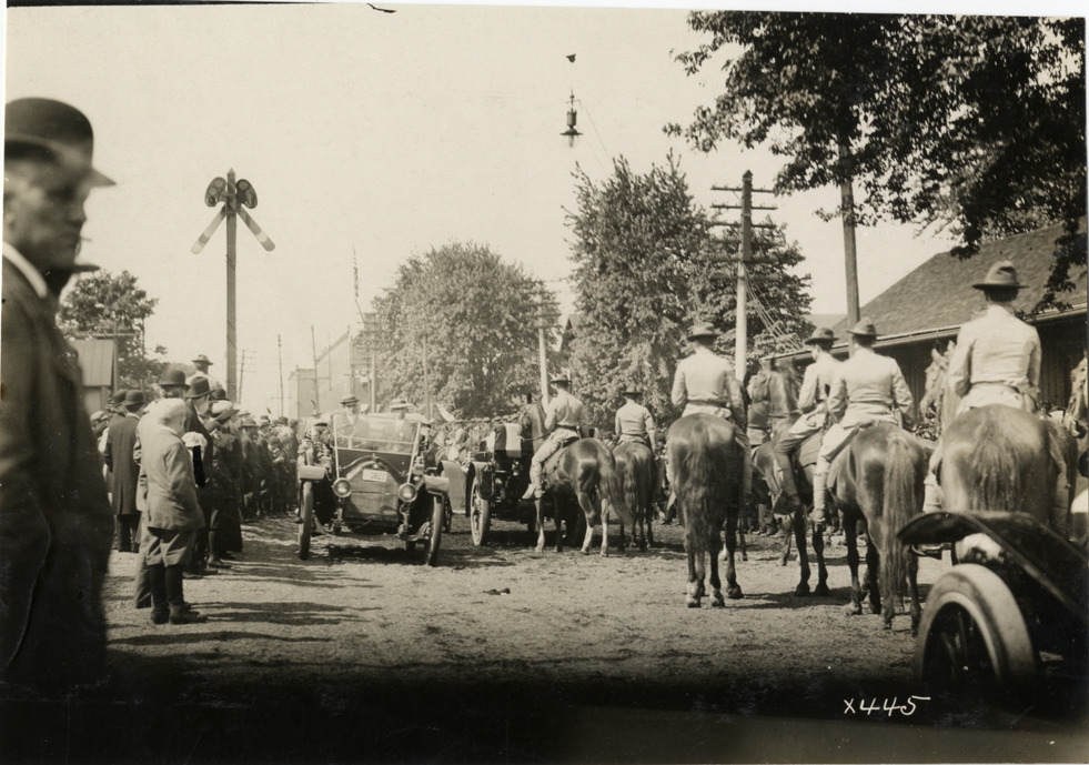 View of automobile, pedestrians and soldiers on horseback at railroad crossing during festivities surrounding the 1910 dedication of the Custer equestrian monument in Monroe, Michigan. Handwritten on back: "Monuments--Custer memorial celebration, 1910."