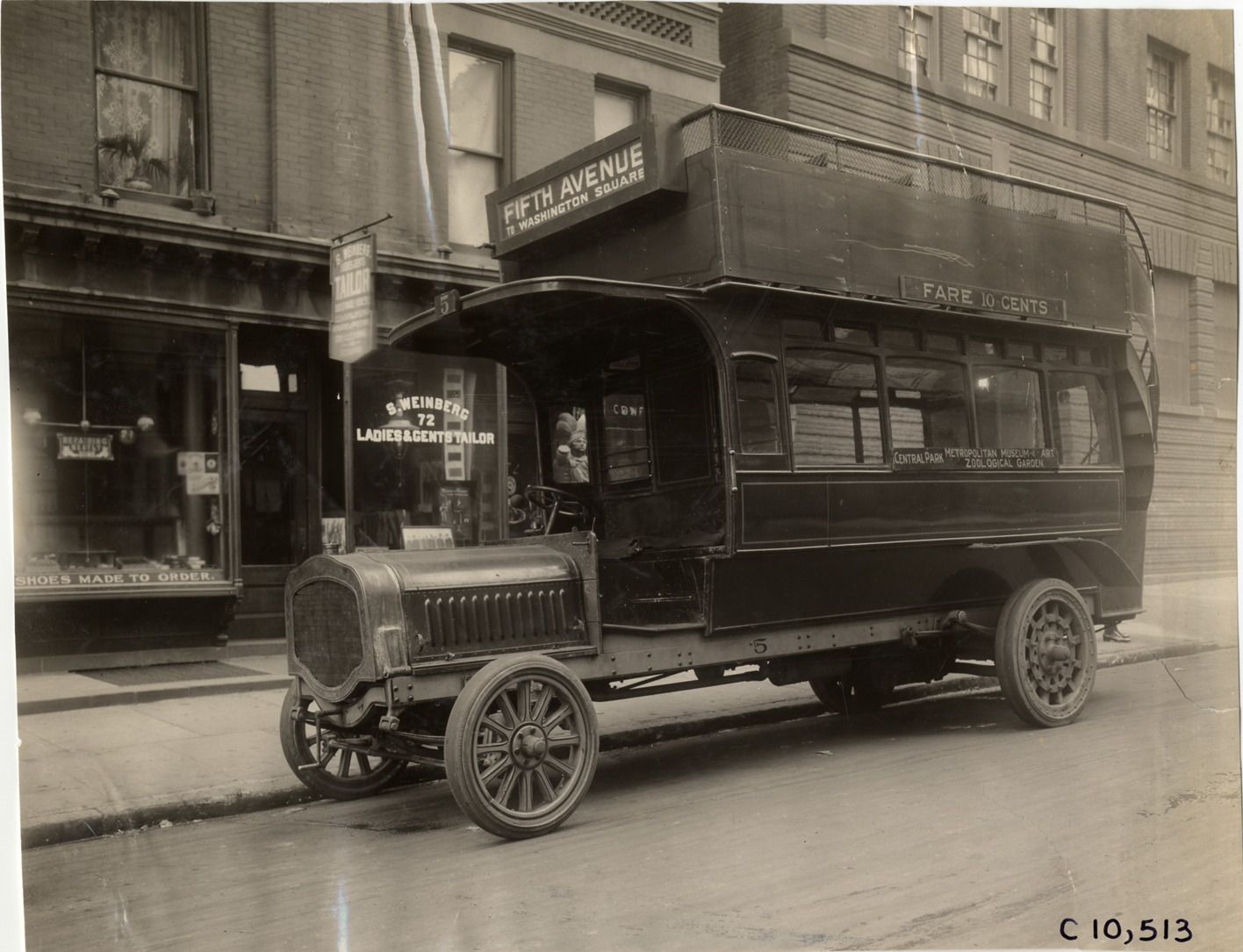 View of 1908 De Dion double-decker bus parked on street. Signs on bus: "Fifth Avenue to Washington Square; fare 10 cents; Central Park, Metropolitan Museum of Art, Zoological Garden." Storefront for S. Weinberg, tailor in background. Stamped on back: "Spooner & Wells, Inc., photographers, telephones 3472-3473 Columbus, 1931 Broadway, New York." Handwritten on back: "Motor buses, De Dion, 1908."