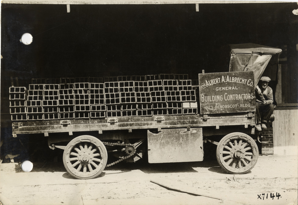 View of man posing with truck owned by Albert A. Albrecht Company, loaded with construction materials. Sign on truck: "The Albert A. Albrecht Co., general building contractors, 823 Penobscot Bldg." Stamped on back: "Spooner & Wells, Inc., photographers, 1231 Woodward Ave., Detroit, Mich., telephone North 1745." Handwritten on back: "Motor trucks--Albrecht. A.A. Albrecht truck."