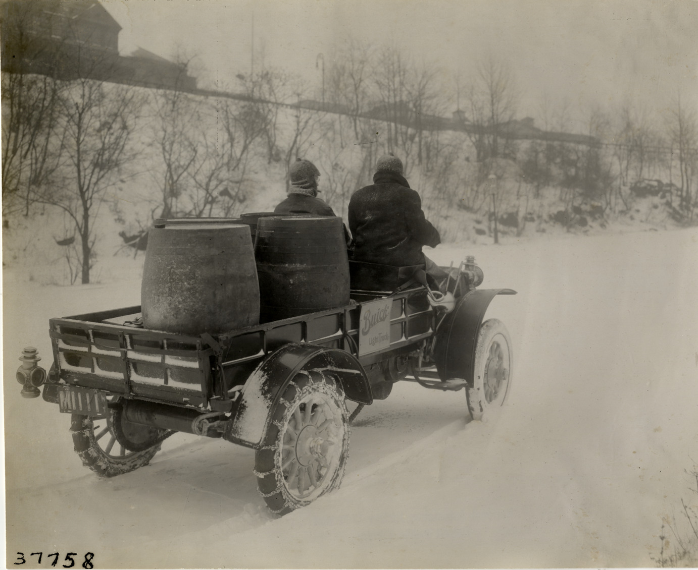 View of driver and passenger hauling wooden barrels in 1910 Buick truck, on snow-covered road. "Buick light truck" sign on side of truck. Stamped on back: "Spooner & Wells, Inc., photographers, telephones 3472-3473 Columbus, 1931 Broadway, New York." Handwritten on back: "Motor trucks--Buick, 1910."