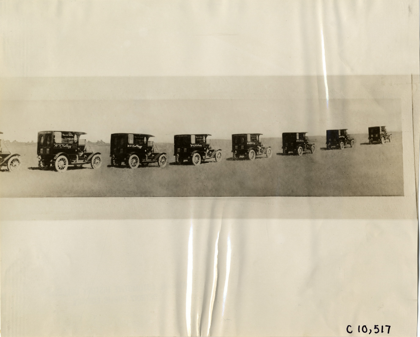 Favorite this☆ 1911 Cartercar trucks, W.K. Kellogg Company Description: View of row of 1911 Cartercar trucks, owned by the W.K. Kellogg Company. Box of Kellogg's toasted corn flakes and "W.K. Kellogg Co., won its favor through its flavor" painted on side of trucks. Handwritten on back: "Motor trucks--Cartercar, 1911." Details Resource ID: na009252 Subject: Trucks Cartercar Company Photographic prints Date Issued: Unknown year Format: 1 photographic print ; 7.5 x 9.25 in. Member of: National Automotive History Collection Lazarnick Collection Filing Location: Motor trucks--Cartercar Negative Number: Negative #C10,517 Rights: Physical rights are retained by DPL. Copyright is retained in accordance with U.S. copyright laws.