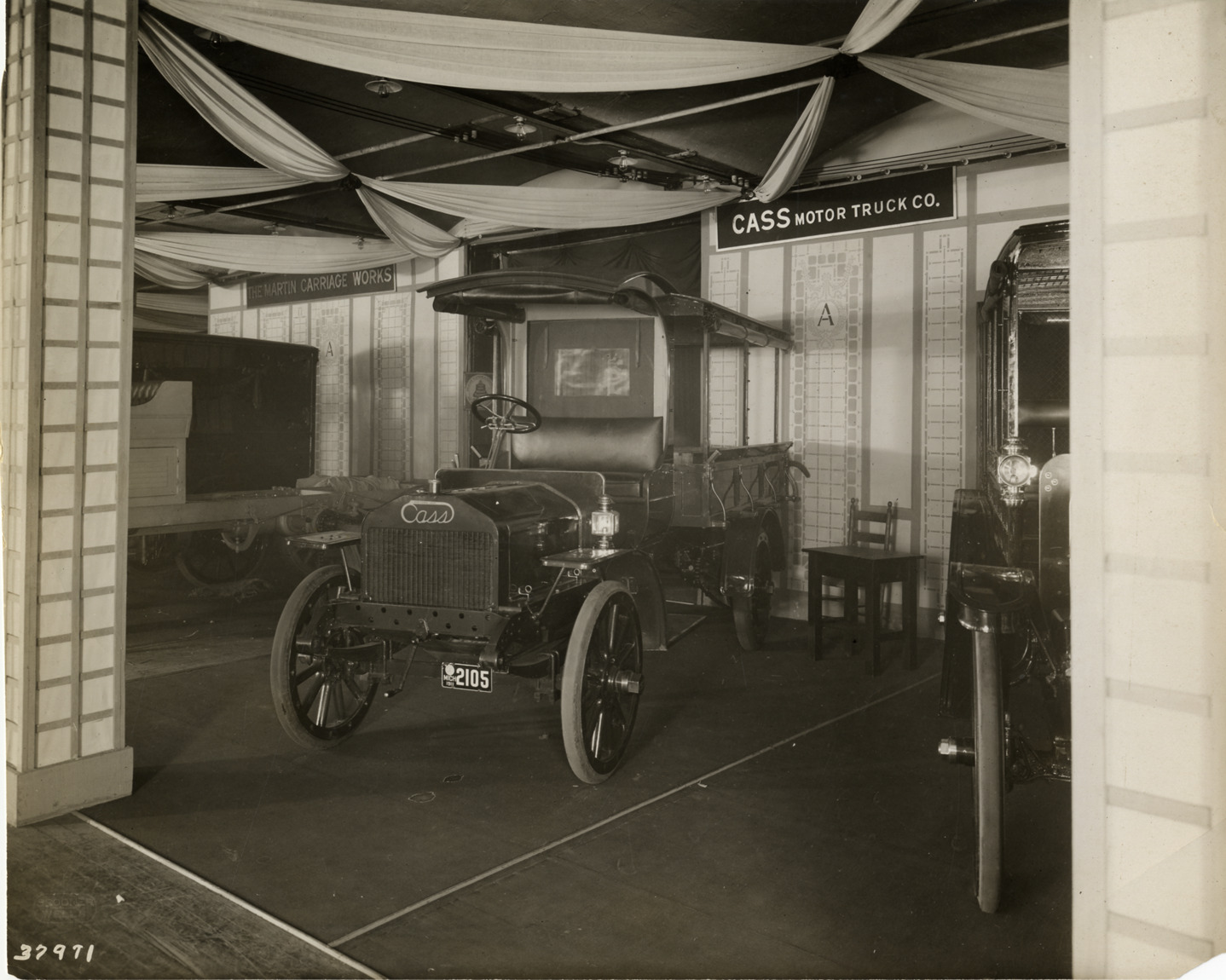 View of Cass truck on display in trade show. "Cass Motor Truck Co." sign in background. Stamped on back: "Spooner & Wells, Inc., photographers, telephones 3472-3473 Columbus, 1931 Broadway, New York." Handwritten on back: "Motor trucks--Cass."