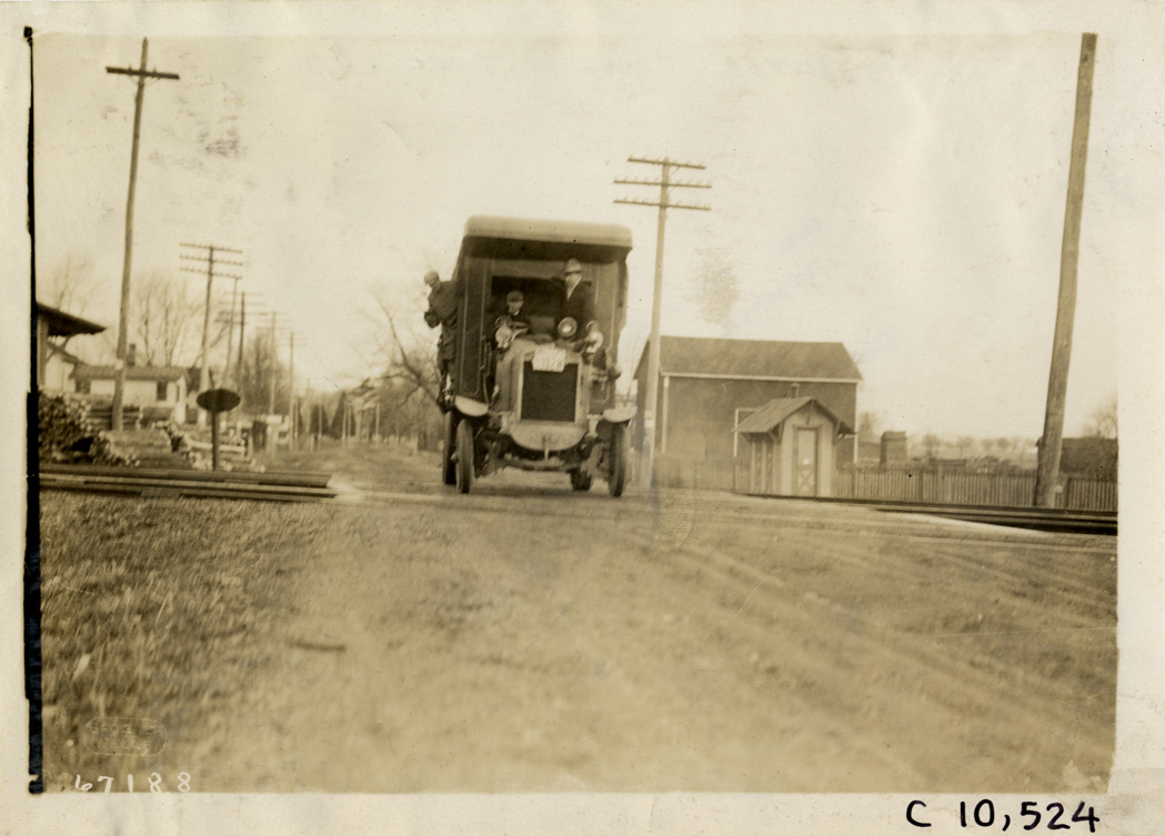 Front view of motorists in 1911 Commer truck, crossing railroad tracks, during demonstration run from Wyckoff, Church & Partridge headquarters in New York City to John Wanamaker store in Philadelphia. Stamped on back: "Spooner & Wells, Inc., photographers, telephones 3472-3473 Columbus, 1931 Broadway, New York." Handwritten on back: "Motor trucks--Commer, 1911."
