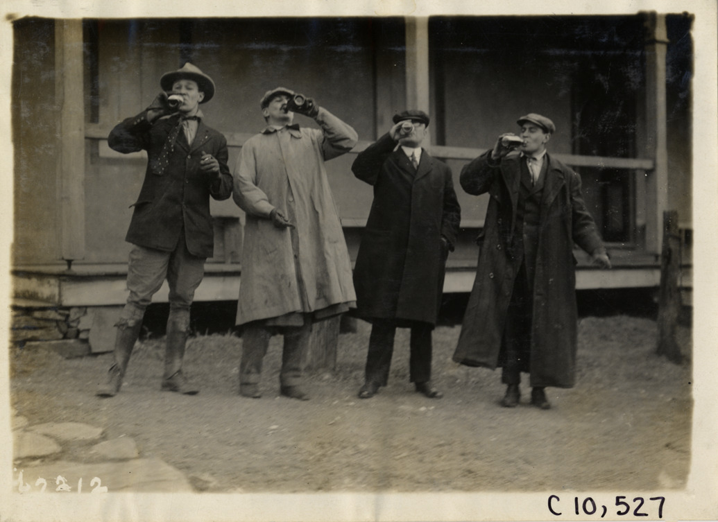 Four men drinking from bottles, 1911 Commer truck demonstration run