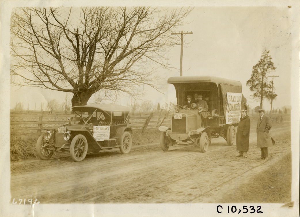 View of 1911 Commer truck and Guy Vaughan car on rural road during demonstration run from Wyckoff, Church & Partridge headquarters in New York City to John Wanamaker store in Philadelphia. Sign on side of truck: "Fully loaded Commer truck. Wyckoff, Church & Partridge, Inc., N.Y. Wanamaker, N.Y. to Wanamaker, Phila. Faster than freight." Sign on side of car: "The Guy Vaughan car, Wyckoff, Church & Partridge, N.Y. Accompanying the Commer truck, Wanamaker, New York to Wanamaker, Phila." Two men stand in road. Stamped on back: "Spooner & Wells, Inc., photographers, telephones 3472-3473 Columbus, 1931 Broadway, New York." Handwritten on back: "Motor trucks--Commer, 1911."