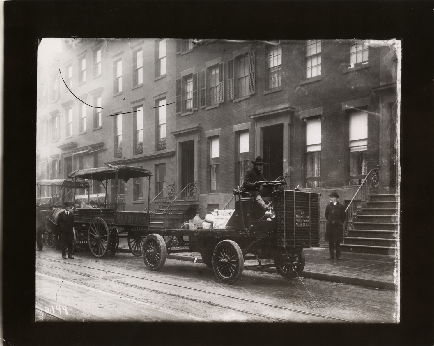 View of driver in Commercial truck, parked in front of apartment buildings. Horse-drawn wagon on left. Stamped on back: "Photographic illustration by Nick Lazarnick, 230 Park Ave., N.Y." Handwritten on back: "Motor trucks--Commercial. Commercial Motor Car Co."