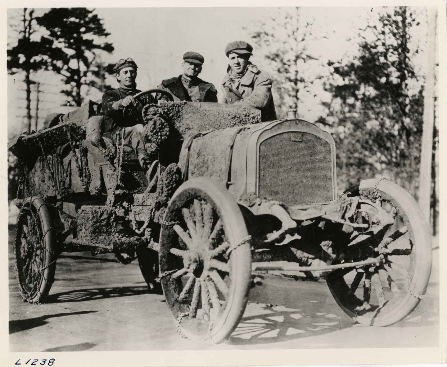 View of driver and passengers in mud-covered F-W-D truck. Typed on back: "Of the first five F-W-D automobiles built, one was converted into a truck to compete in test run under Capt. A.E. Williams from Washington, D.C. to Fort Benjamin Harrison, Indianapolis, Ind. This test, run in snow and mud and over mountains in late winter and early spring of 1912, was the first proof that the motor truck might replace the mule as means of transport for the Army." Handwritten on back: "Motor trucks--F-W-D."