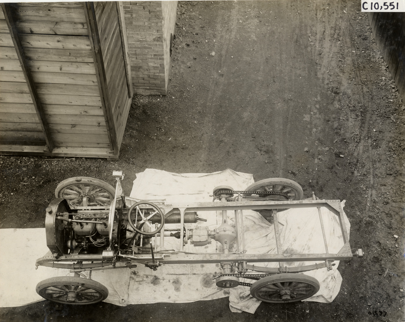 Overhead view of 1910 Federal truck chassis. Handwritten on back: "Motor trucks--Federal, 1910."