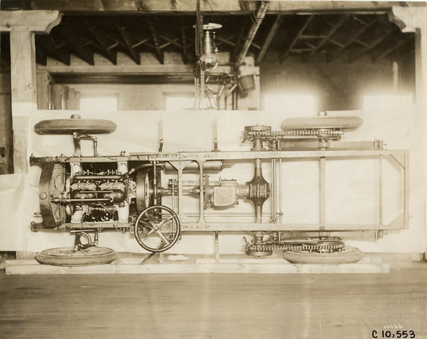 View of chassis for 1912 Federal truck, turned on its side. Handwritten on back: "Motor trucks--Federal, 1912."