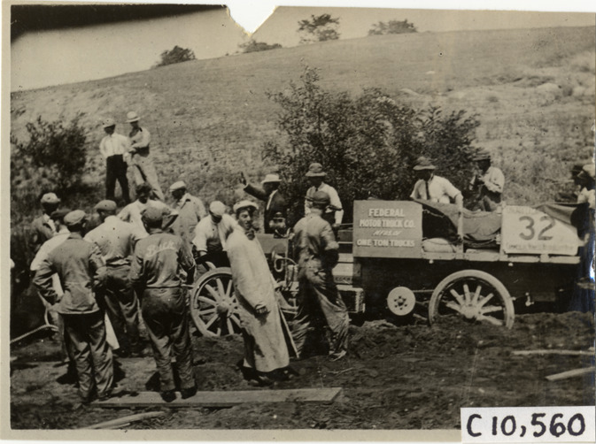 Men trying to dislodge 1912 Federal truck stuck in road, Chicago Evening American Commercial Vehicle Reliability Run