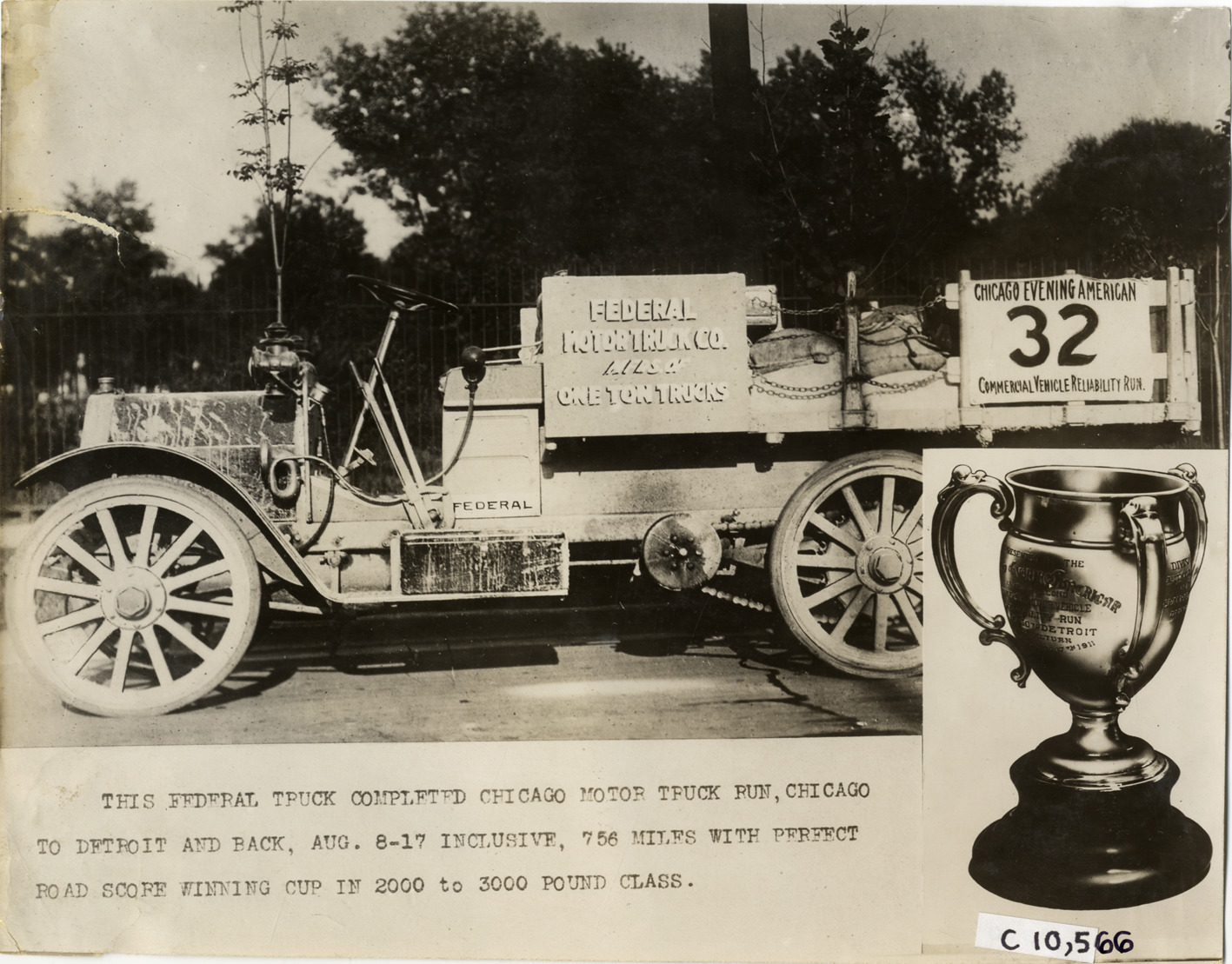 View of 1912 Federal truck which completed the Commercial Vehicle Reliability Run sponsored by the Chicago Evening American. Sign on side of truck: "Federal Motor Truck Co., mfrs. of one ton trucks" and "Chicago Evening American, 32, Commercial Vehicle Reliability Run." Printed on front: "This Federal truck completed Chicago motor truck run, Chicago to Detroit and back, Aug. 8-17 inclusive, 756 miles with perfect road score, winning cup in 2000 to 3000 pound class." Inset view of trophy cup presented to winners. Handwritten on back: "Motor trucks--Federal, 1912."