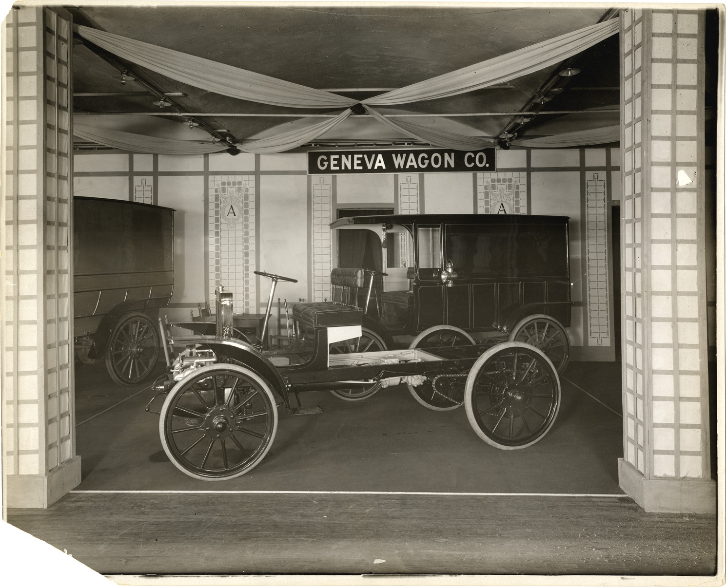 View of Geneva truck and truck chassis on display in trade show. "Geneva Wagon Co." over display. Stamped on back: "Spooner & Wells, Inc., photographers, telephones 3472-3473 Columbus, 1931 Broadway, New York." Handwritten on back: "Motor trucks--Geneva."