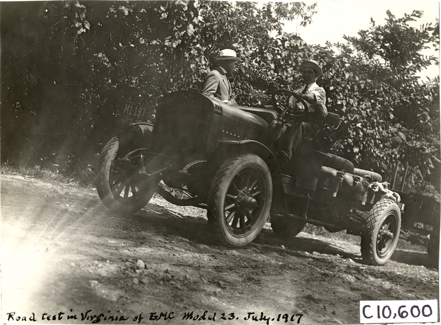 View of driver and passenger in 1917 GMC Model 23 truck on rural road in Virginia. Handwritten on front: "Road test in Virginia of GMC Model 23, July, 1917." Handwritten on back: "Motor trucks--GMC, 1917."