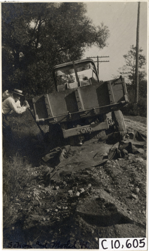 View of Mr. Schon attempting to dislodge 1915 GMC Model 41 truck stuck on roadside. Handwritten on front: "Schon and Model 41." Handwritten on back: "Motor trucks--GMC, 1915."