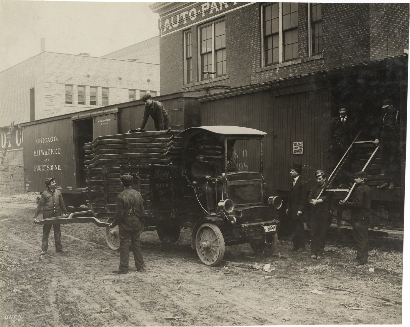 View of men loading motor vehicle frames onto 1910 Grabowsky truck owned by Regal Motor Car Company. "Regal Motor Car Co." painted on side of truck; Chicago, Milwaukee and Puget Sound railroad cars in background. Stamped on back: "Spooner & Wells, Inc., photographers, telephone North 1745. 1231 Woodward Ave., Detroit, Mich. Detroit, 1231 Woodward, New York, 1931 Broadway." Handwritten on back: "Motor trucks--Grabowsky, 1910."