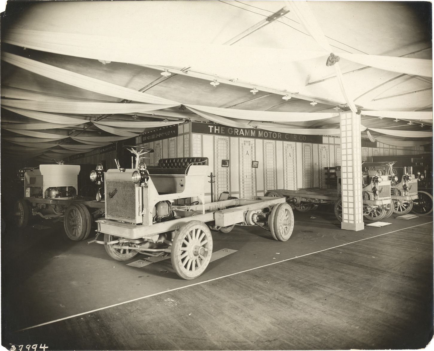 Favorite this☆ Gramm trucks on display Description: View of Gramm trucks on display in trade show. "The Gramm Motor Car Co." sign in background. Stamped on back: "Spooner & Wells, Inc., photographers, telephones 3472-3473 Columbus, 1931 Broadway, New York." Handwritten on back: "Motor trucks--Gramm." Details Resource ID: na009393 Creator: Spooner & Wells Subject: Trucks Gramm Motor Car Company Trade shows Photographers--New York (State)--New York Photographic prints Date Issued: Unknown year Format: 1 photographic print ; 8 x 9.75 in. Member of: National Automotive History Collection Lazarnick Collection Filing Location: Motor trucks--Gramm Rights: Physical rights are retained by DPL. Copyright is retained in accordance with U.S. copyright laws.