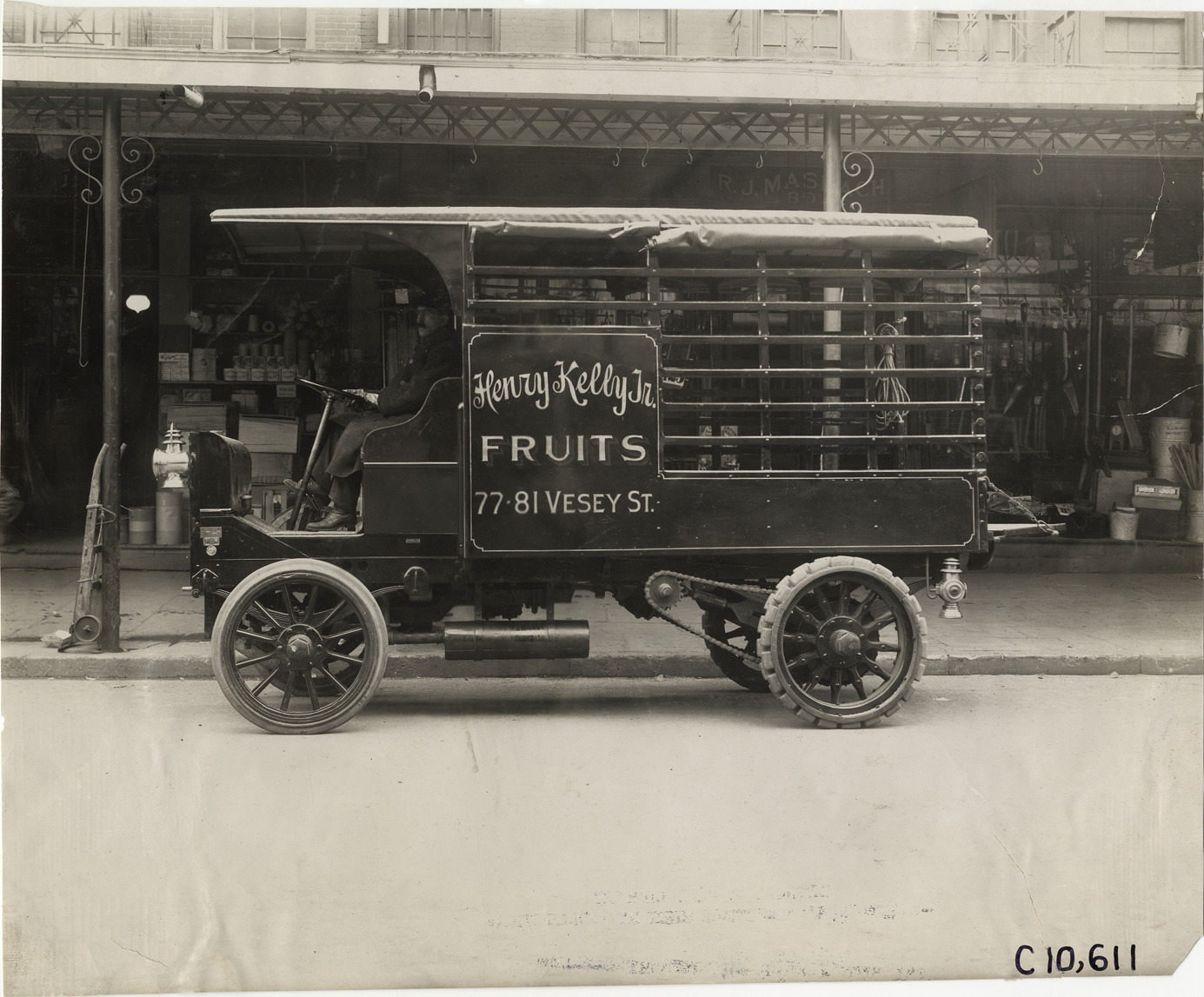 View of driver in 1909 Hewitt truck owned by the Henry Kelly, Jr. firm. "Henry Kelly, Jr., fruits, 77-81 Vesey St." painted on side of truck. Handwritten on back: "Motor trucks--Hewitt, 1909."