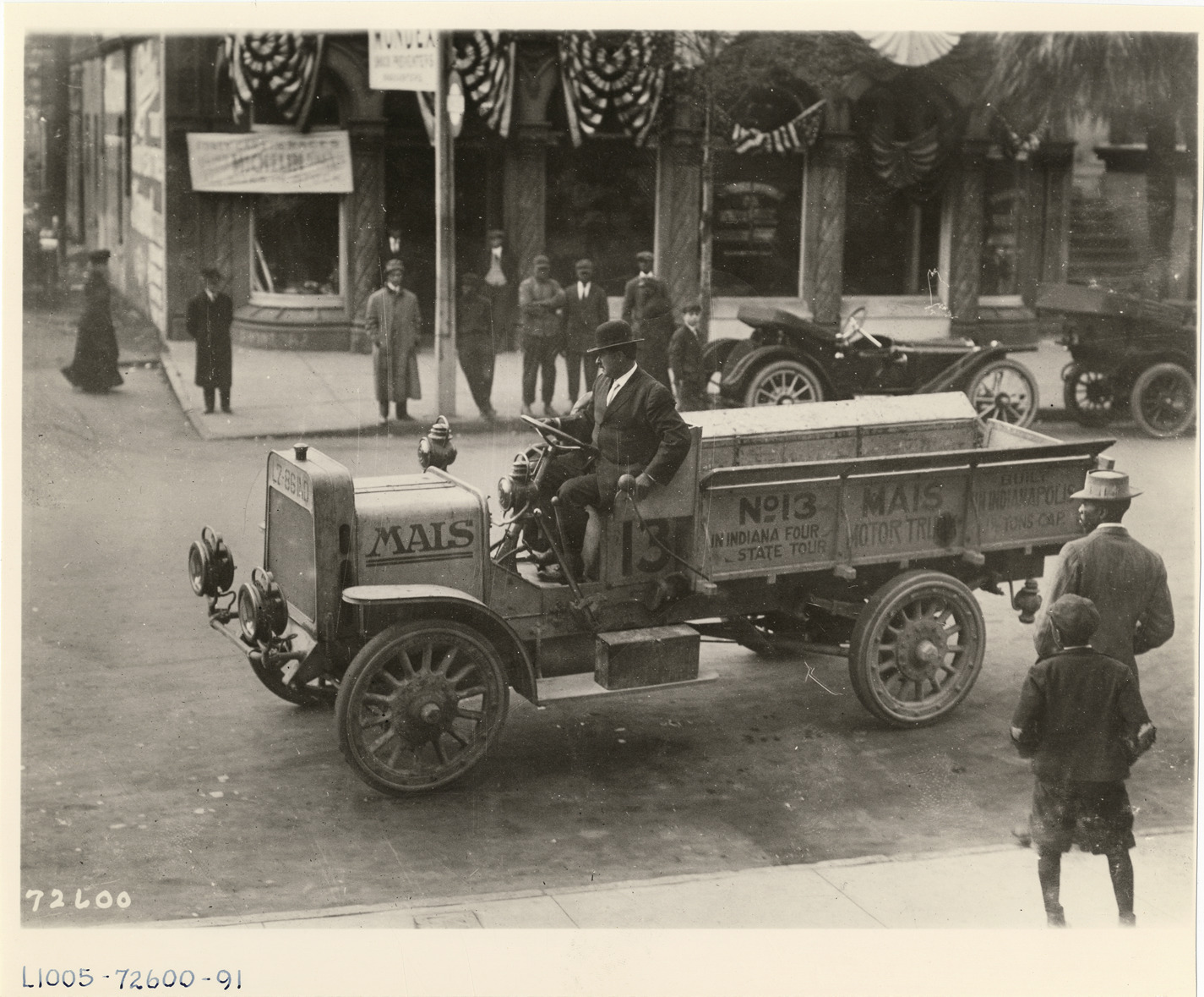 View of driver in Mais truck during Indiana Four States Tour. "Mais motor truck, no. 13, in Indiana Four State [sic] Tour, built in Indianapolis ... tons, cap" painted on side of truck. Spectators stand on sidewalks; building decorated with bunting in background. Handwritten on back: "Motor trucks--Mais."