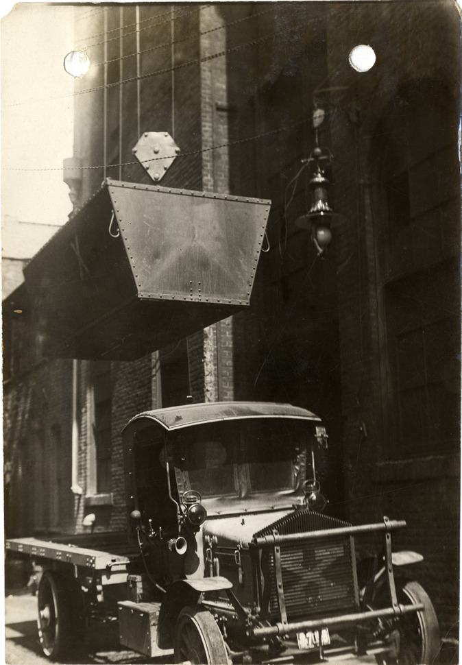 View of cargo bin being lowered onto coal truck owned by J.A. Mercier, contractor. Handwritten on back: "Motor trucks--Mercier. Mercer [sic] truck."