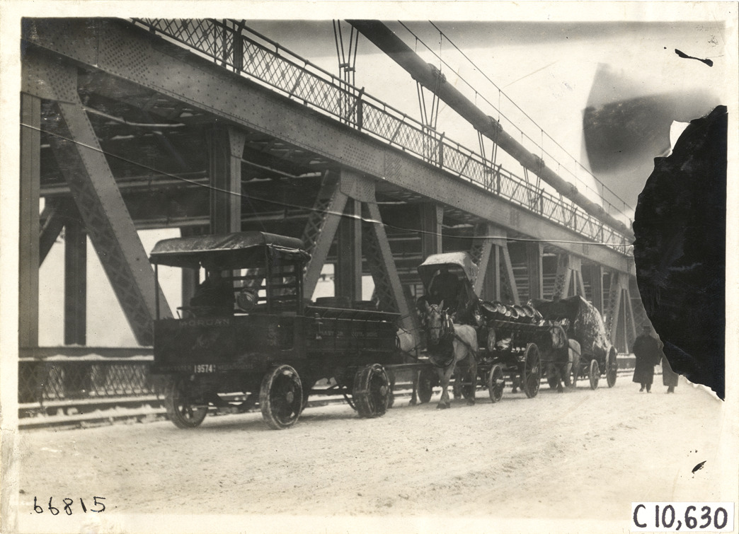 View of 1911 Morgan truck traveling on snow-covered bridge. Truck is followed by horse-drawn wagon carrying load of barrels. "Morgan" painted on front of truck. Stamped on back: "Spooner & Wells, Inc., photographers, telephones 3472-3473 Columbus, 1931 Broadway, New York." Handwritten on back: "Motor trucks--Morgan, 1911."