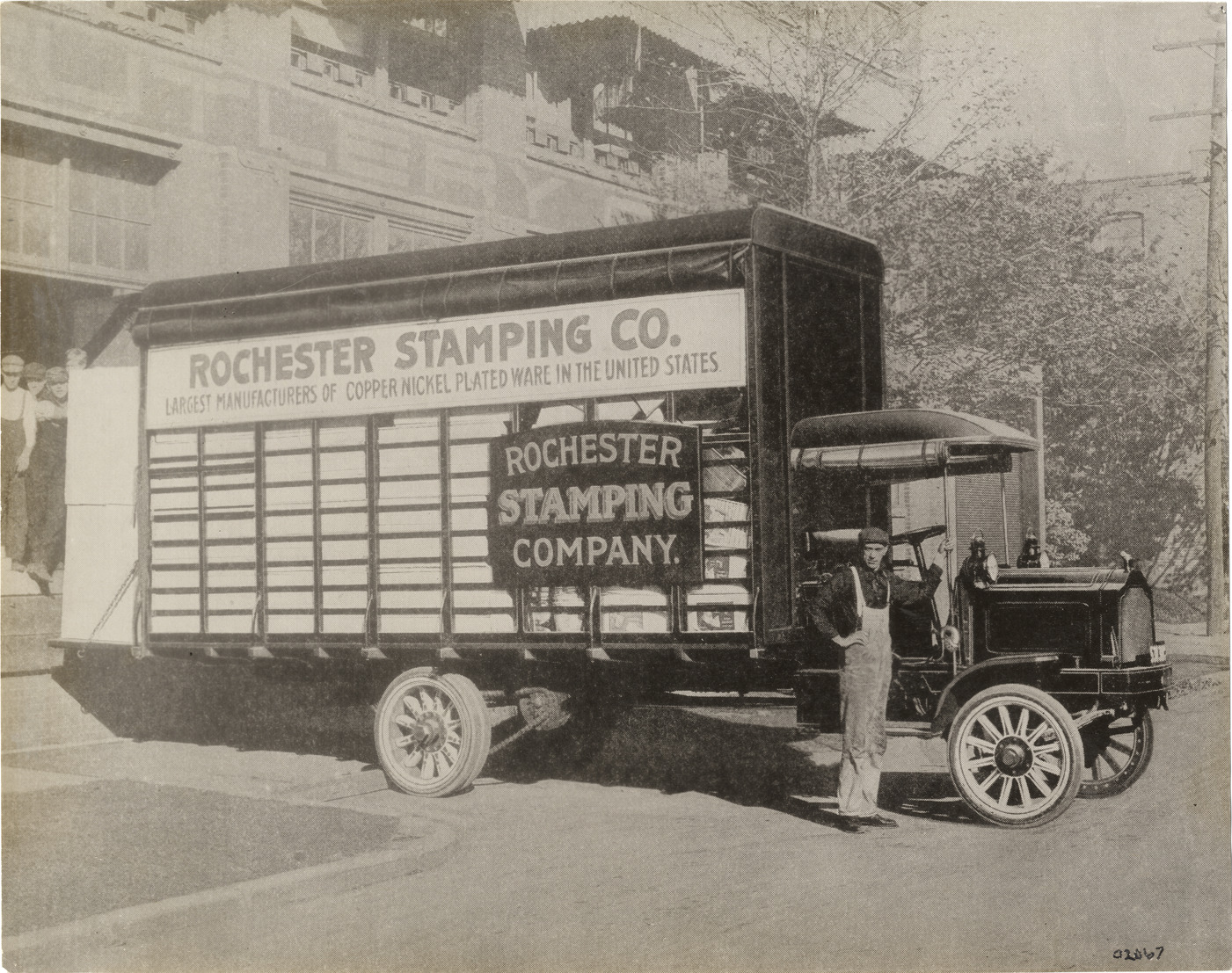 View of driver posing with 1911 Packard truck owned by Rochester Stamping Company. Signs on side of truck: "Rochester Stamping Co., largest manufacturers of copper nickel plated ware in the United States, Rochester Stamping Company." Handwritten on back: "Motor trucks--Packard, 1911."
