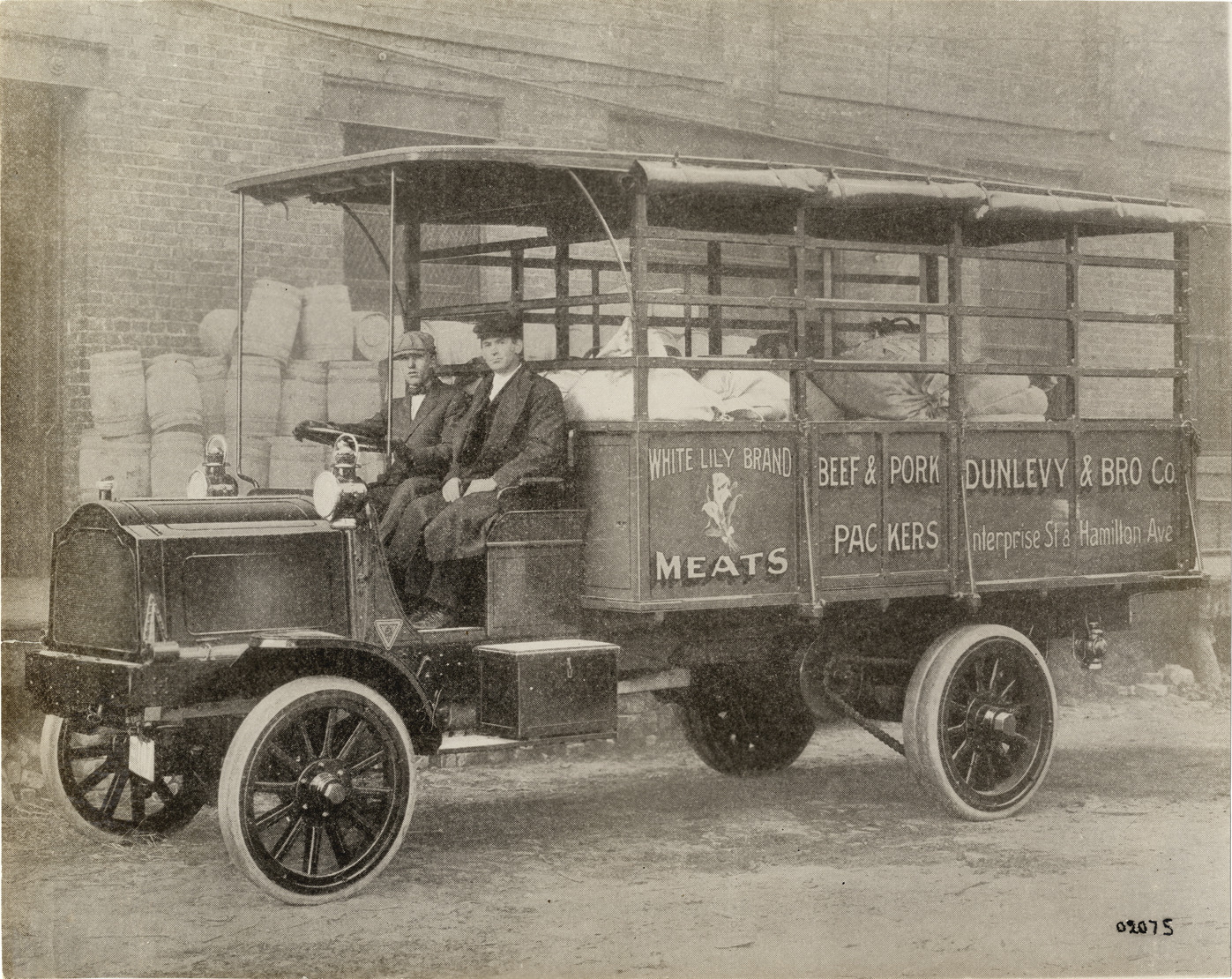 View of driver and passenger in 1911 Packard truck, owned by Dunlevy & Bro. Co. "Dunlevy & Bro. Co., beef & pork packers, Enterprise St. & Hamilton Ave., White Lily brand meats" painted on side of truck. Handwritten on back: "Motor trucks--Packard, 1911."