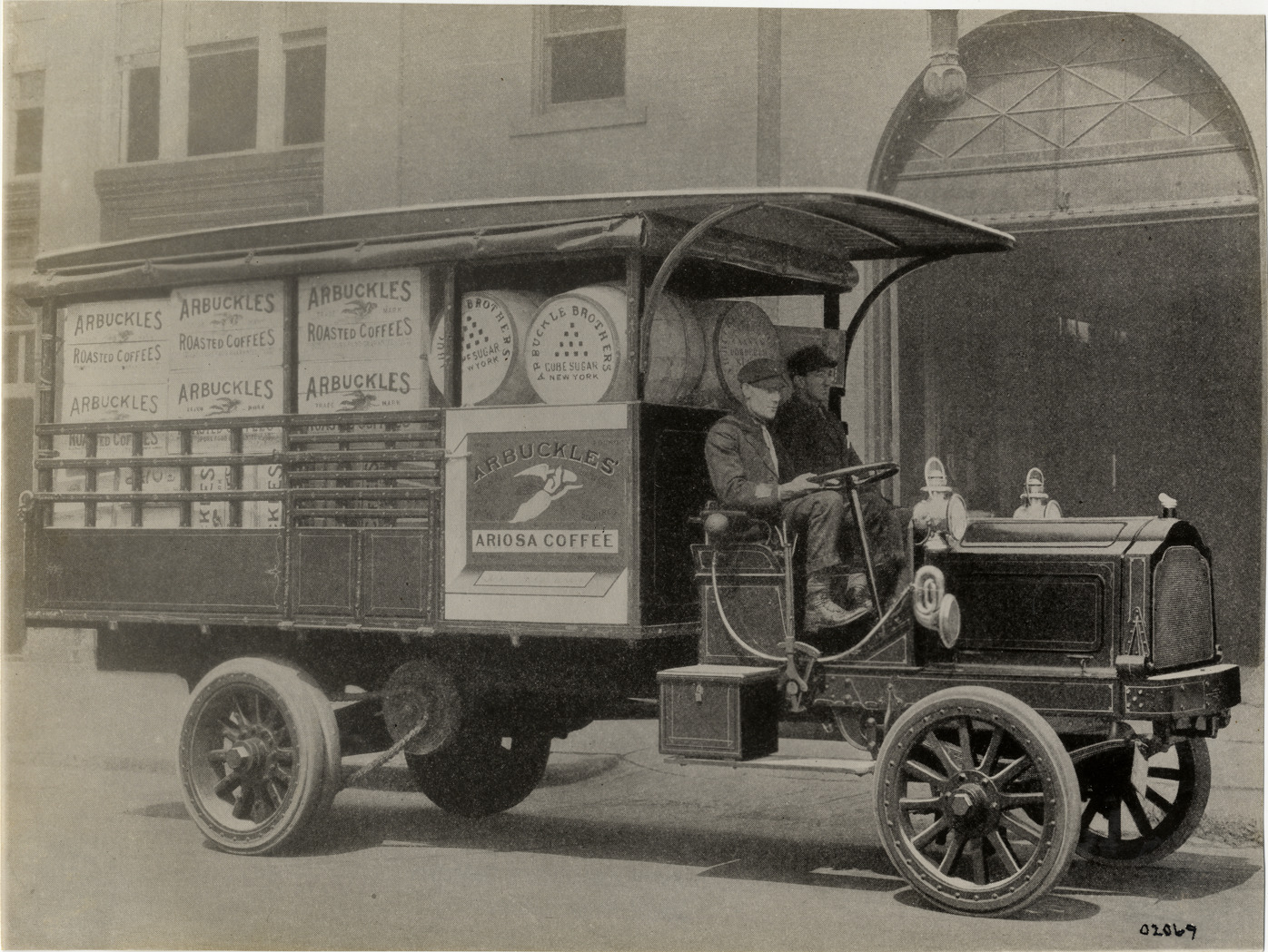 View of driver and passenger in 1911 Packard truck, owned by Arbuckle Brothers. Boxes of Arbuckle's roasted coffees and Arbuckle Brothers cube sugar in back of truck. "Arbuckle's, Ariosa coffee" painted on side of truck. Handwritten on back: "Motor trucks--Packard, 1911."