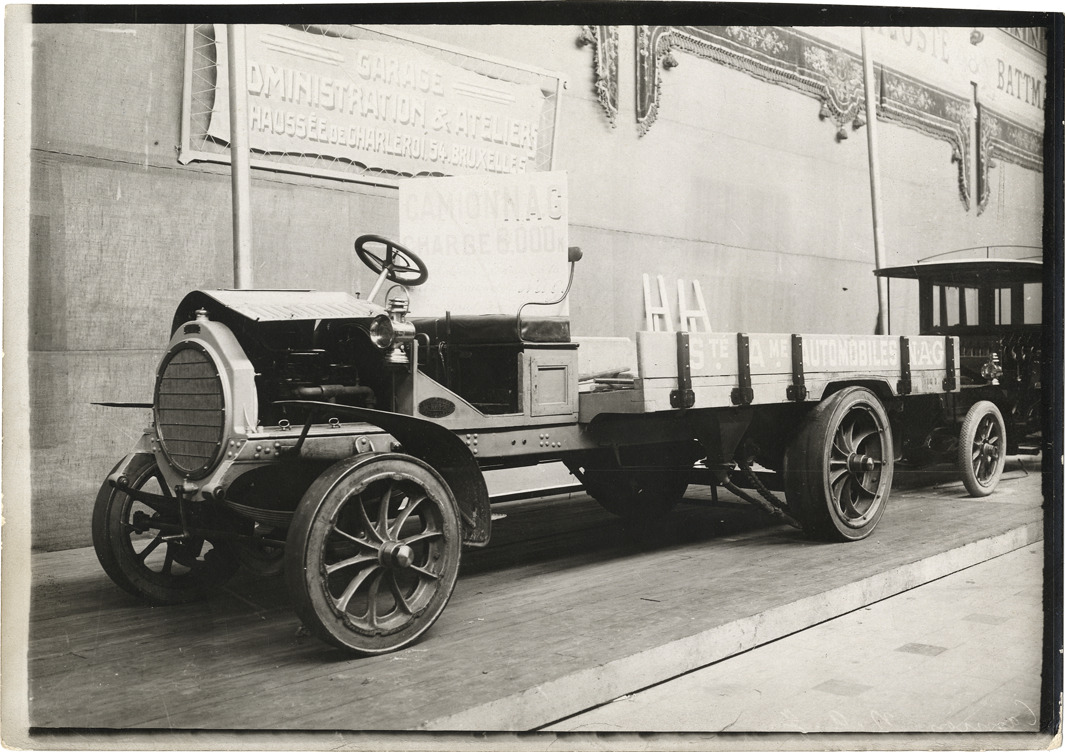 View of N.A.G. truck with sign: "Camion N.A.G., charge 6,000." Sign on back wall reads: "Garage, administration & ateliers, chaussee de Charleroi, 54, Bruxelles." Stamped on back: "Photo by N. Lazarnick, 29 West 42nd Street, New York." Handwritten on back: "Motor trucks--N.A.G. VIIe Salon Belge Camion N.A.G."