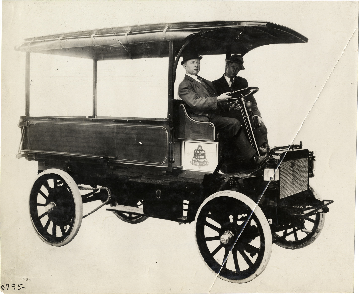 View of driver and passenger in 1910 Randolph truck. Bell logo with "Local and long distance telephone" painted on side of truck. Handwritten on back: "Motor trucks--Randolph, 1910."