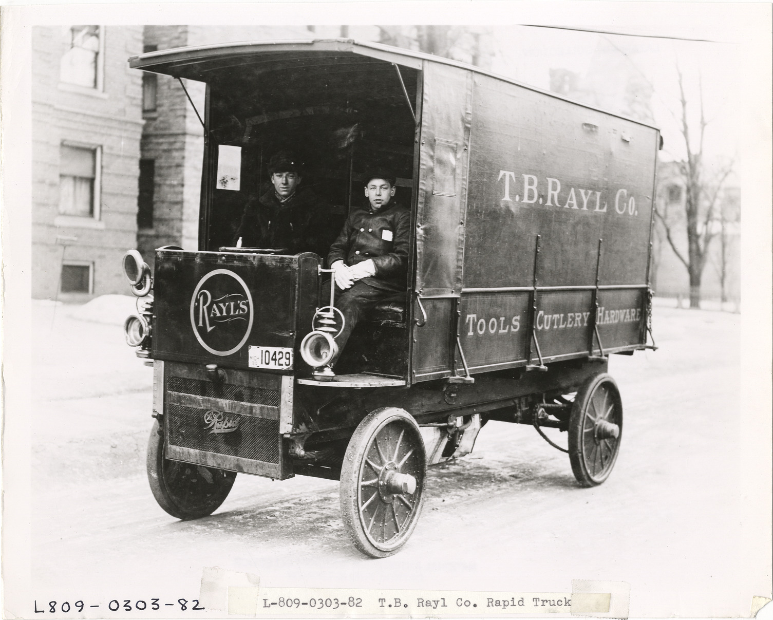 View of driver and passenger in Rapid truck owned by T.B. Rayl Company. "T.B. Rayl Co., tools, cutlery, hardware" painted on side of truck; "Rayl's" painted on front. Typed on front: "T.B. Rayl Co., Rapid truck." Handwritten on back: "Motor trucks--Rapid."