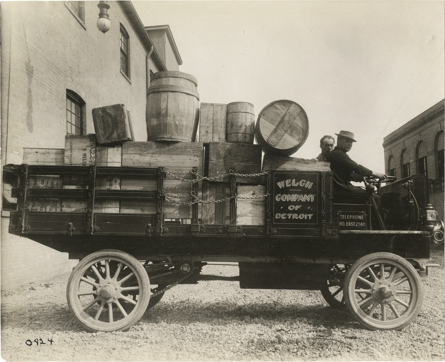 View of driver and passenger in 1910 Rapid truck owned by Welch Company of Detroit. Truck carries load of boxes and barrels; "Welch Company of Detroit, telephone no. East 2560" painted on side of truck. Handwritten on back: "Motor trucks--Rapid, 1910."