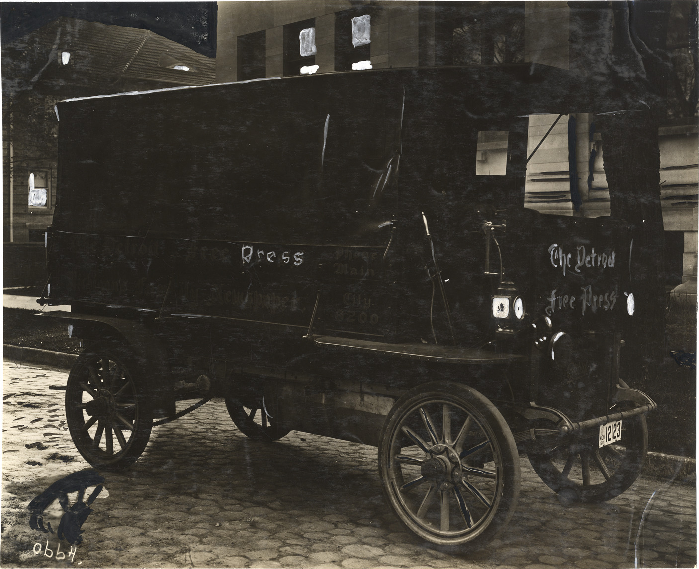 View of driver in Rapid truck owned by the Detroit Free Press. "The Detroit Free Press, Michigan's family newspaper, phone Main City 6200" painted on side of truck. Stamped on back: "Spooner & Wells, Inc., photographers, telephone North 1745. 1231 Woodward Ave., Detroit, Mich. Detroit, 1231 Woodward, New York, 1931 Broadway." Handwritten on back: "Motor trucks--Rapid, 1910."