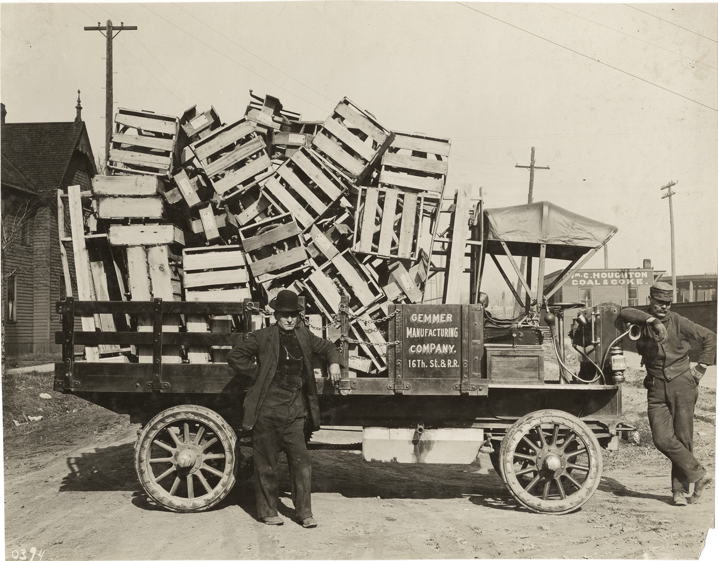 Two men with 1910 Rapid truck, Gemmer Manufacturing Company