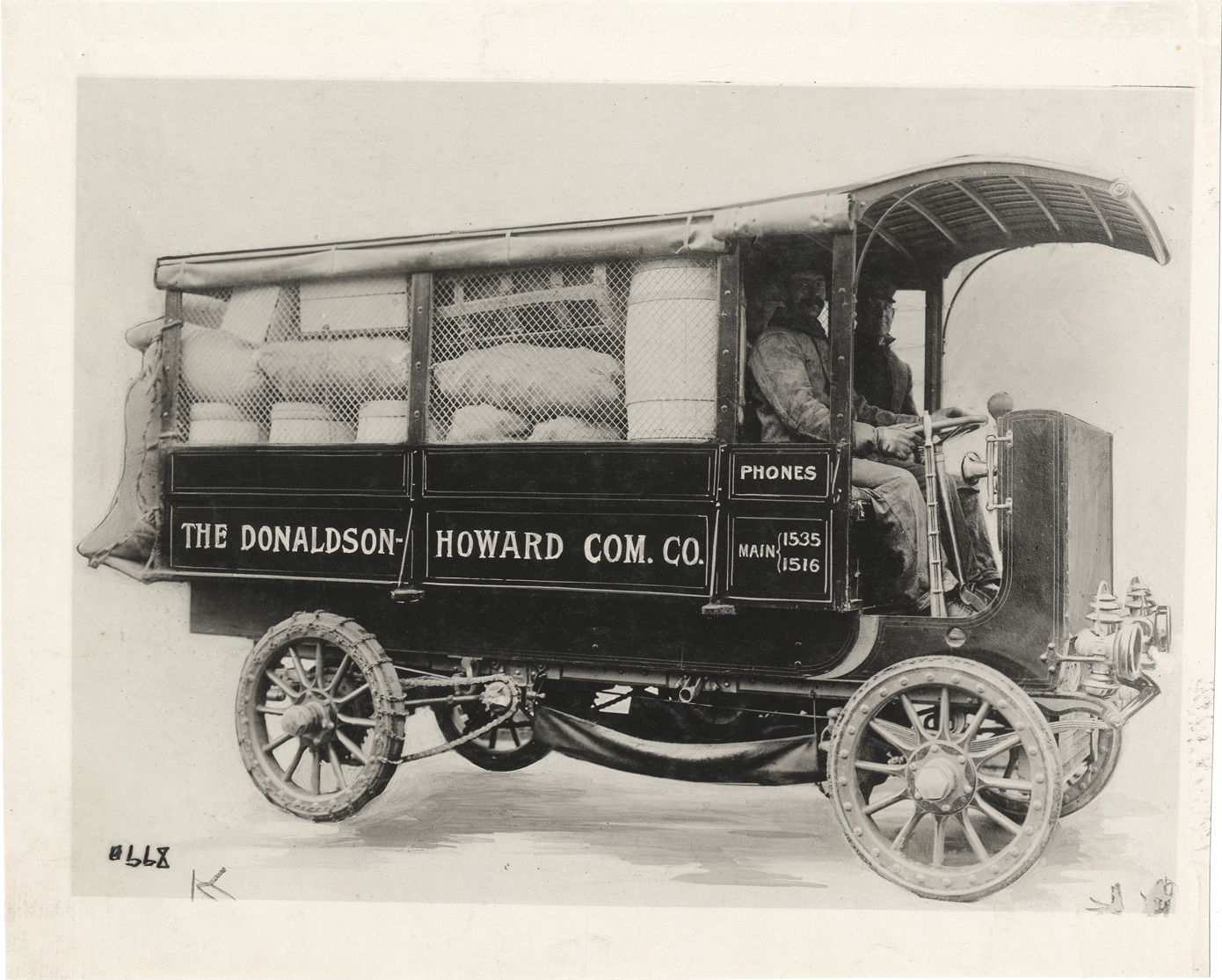 View of driver and passenger in 1910 Rapid truck, owned by Donaldson-Howard Com. Company. "The Donaldson-Howard Com. Co., phones Main 1535, 1516" painted on side of truck. Handwritten on back: "Motor trucks--Rapid, 1910."