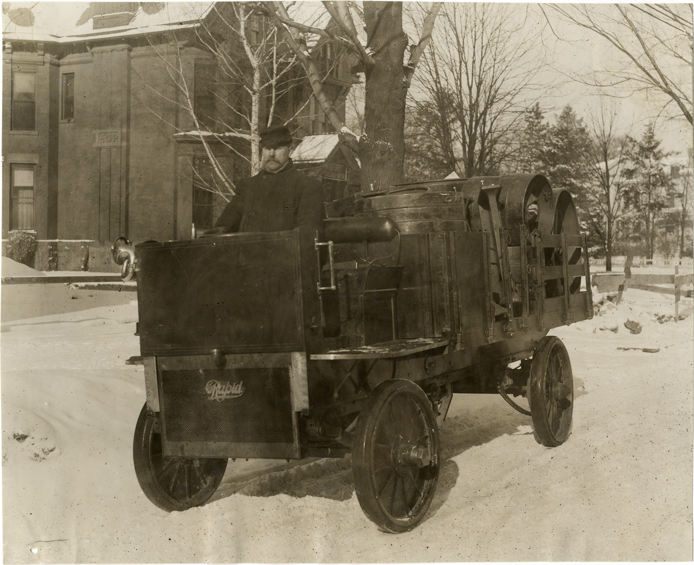 View of driver in 1910 Rapid truck carrying a load of barrels. Stamped on back: "Spooner & Wells, Inc., photographers, telephone North 1745. 1231 Woodward Ave., Detroit, Mich. Detroit, 1231 Woodward, New York, 1931 Broadway." Handwritten on back: "Motor trucks--Rapid, 1910."