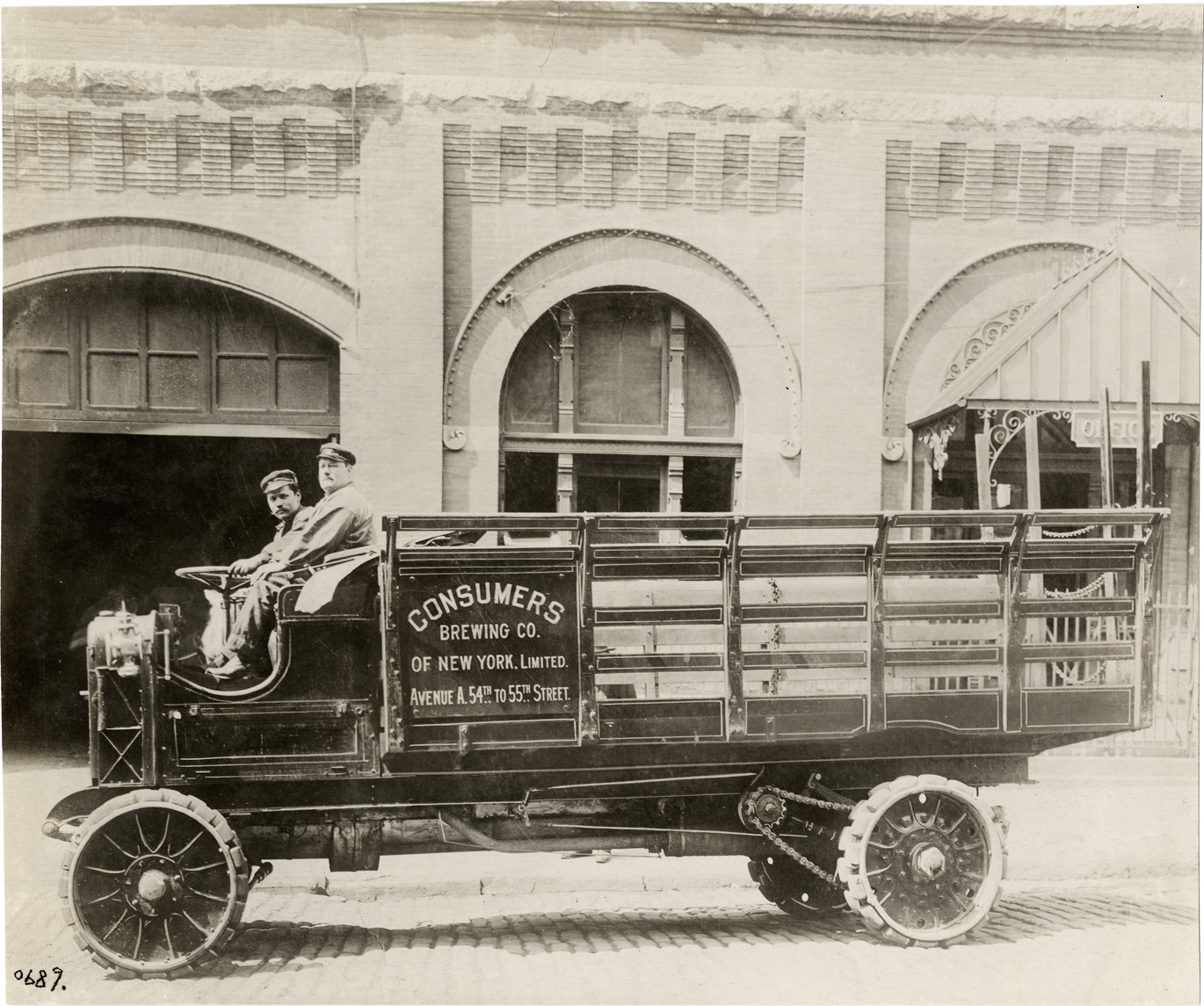 View of driver and passenger in 1910 Rapid truck owned by Consumers Brewing Company. "Consumers Brewing Co. of New York, Limited. Avenue A, 54th to 55th Street" painted on truck. Handwritten on back: "Motor trucks--Rapid, 1910."
