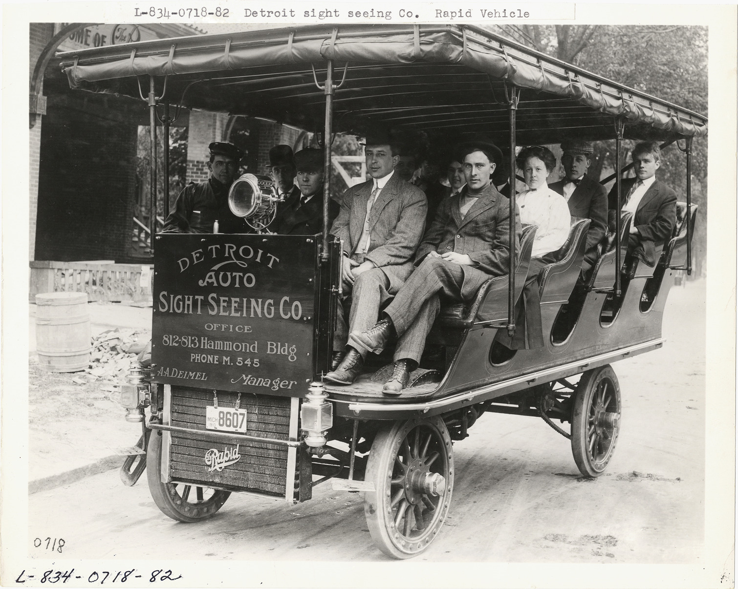 View of men and women in Rapid sightseeing bus. Sign on front of vehicle reads: "Detroit Auto Sight Seeing Co., office 812-813 Hammond Bldg., Phone M. 545, A.A. Deimel, manager." Typed on front: "Detroit Sight Seeing Co., Rapid vehicle." Handwritten on back: "Motor trucks--Rapid."