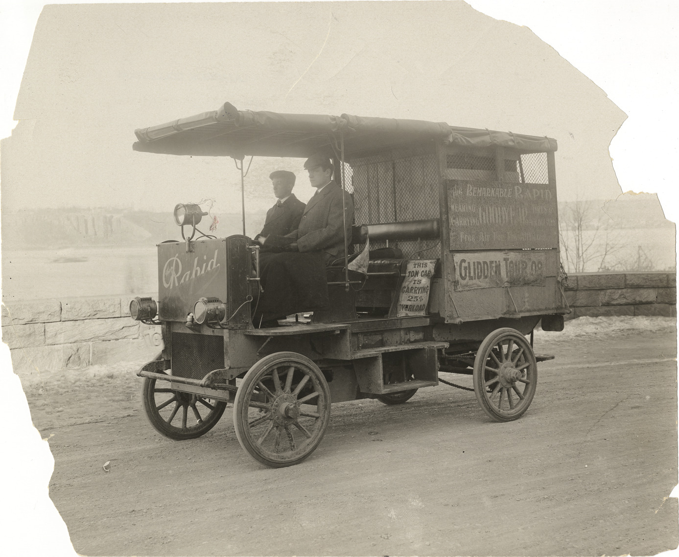 Driver and passenger in Rapid Truck, 1908 Glidden Tour