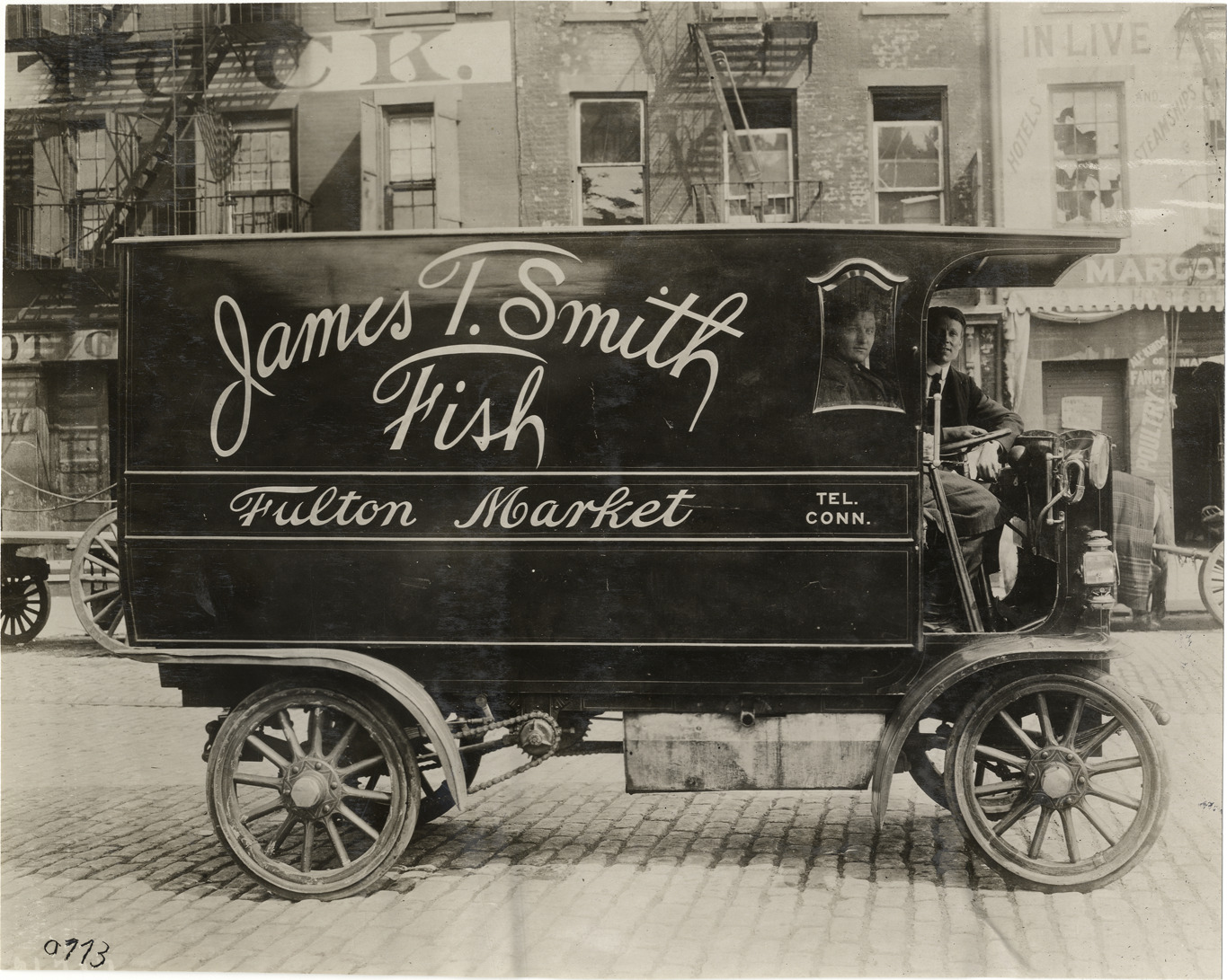 View of driver and passenger in 1910 Rapid truck owned by the James T. Smith firm. "James T. Smith, fish, Fulton Market, tel. Conn." painted on side of truck. Handwritten on back: "Motor trucks--Rapid, 1910."