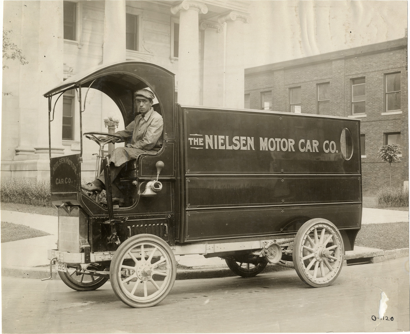 View of driver in 1910 Rapid truck owned by Nielsen Motor Car Company. "The Nielsen Motor Car Co." painted on side of truck. Stamped on back: "Spooner & Wells, Inc., photographers, telephone North 1745. 1231 Woodward Ave., Detroit, Mich. Detroit, 1231 Woodward, New York, 1931 Broadway." Handwritten on back: "Motor trucks--Rapid, 1910."