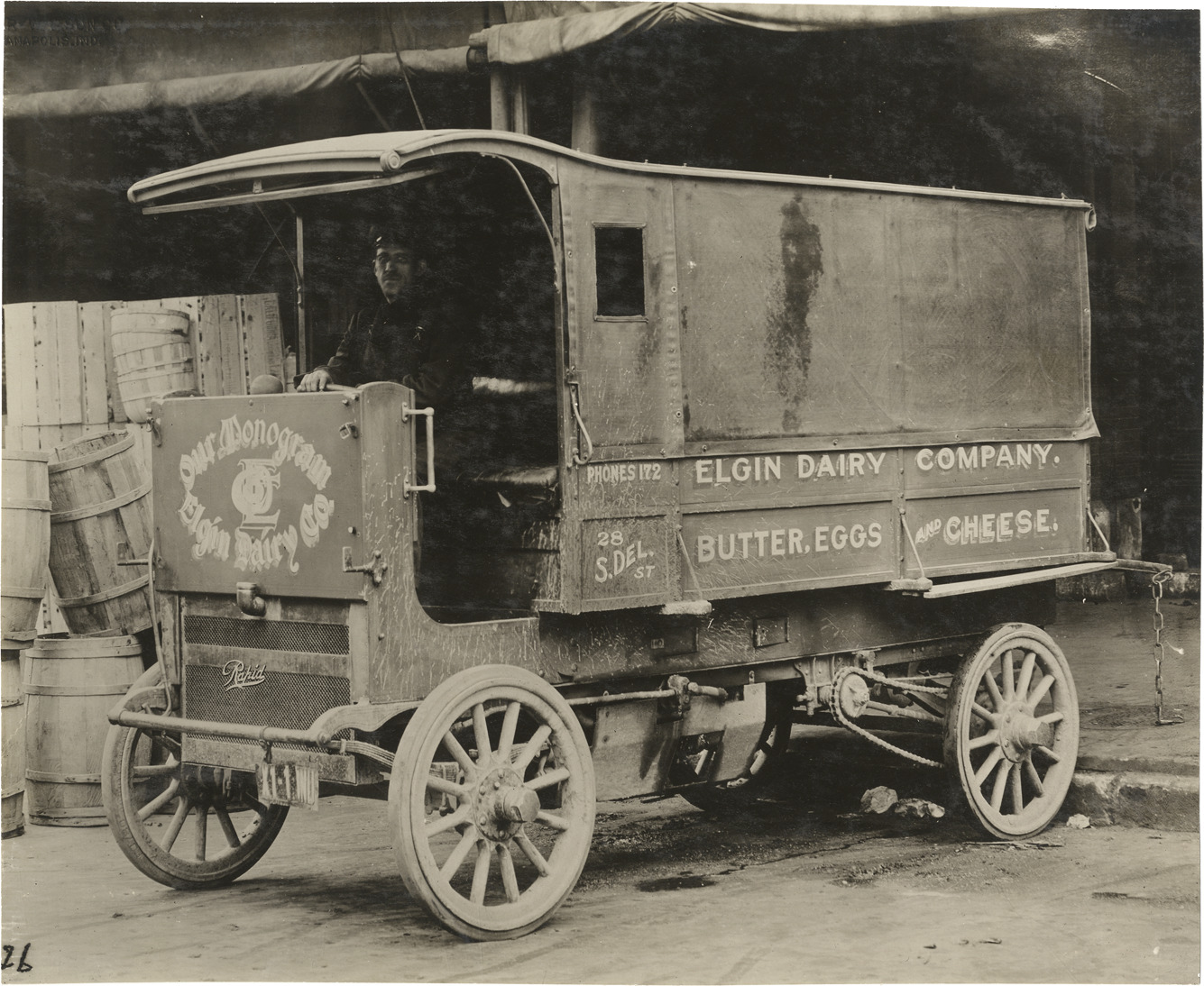 Favorite this☆ Driver in 1910 Rapid Truck, Elgin Dairy Company Description: View of driver in 1910 Rapid truck owned by Elgin Dairy Company. "Elgin Dairy Company, our monogram, butter, eggs and cheese, phones 172, 28 S. Del. St." painted on side of truck. Handwritten on back: "Motor trucks--Rapid, 1910." Details Resource ID: na009571 Subject: Trucks Rapid Motor Vehicle Company Dairy products--Transportation Photographic prints Date Issued: Unknown year Format: 1 photographic print ; 7.5 x 9 in. Member of: National Automotive History Collection Lazarnick Collection Filing Location: Motor trucks--Rapid #3 Rights: Physical rights are retained by DPL. Copyright is retained in accordance with U.S. copyright laws.