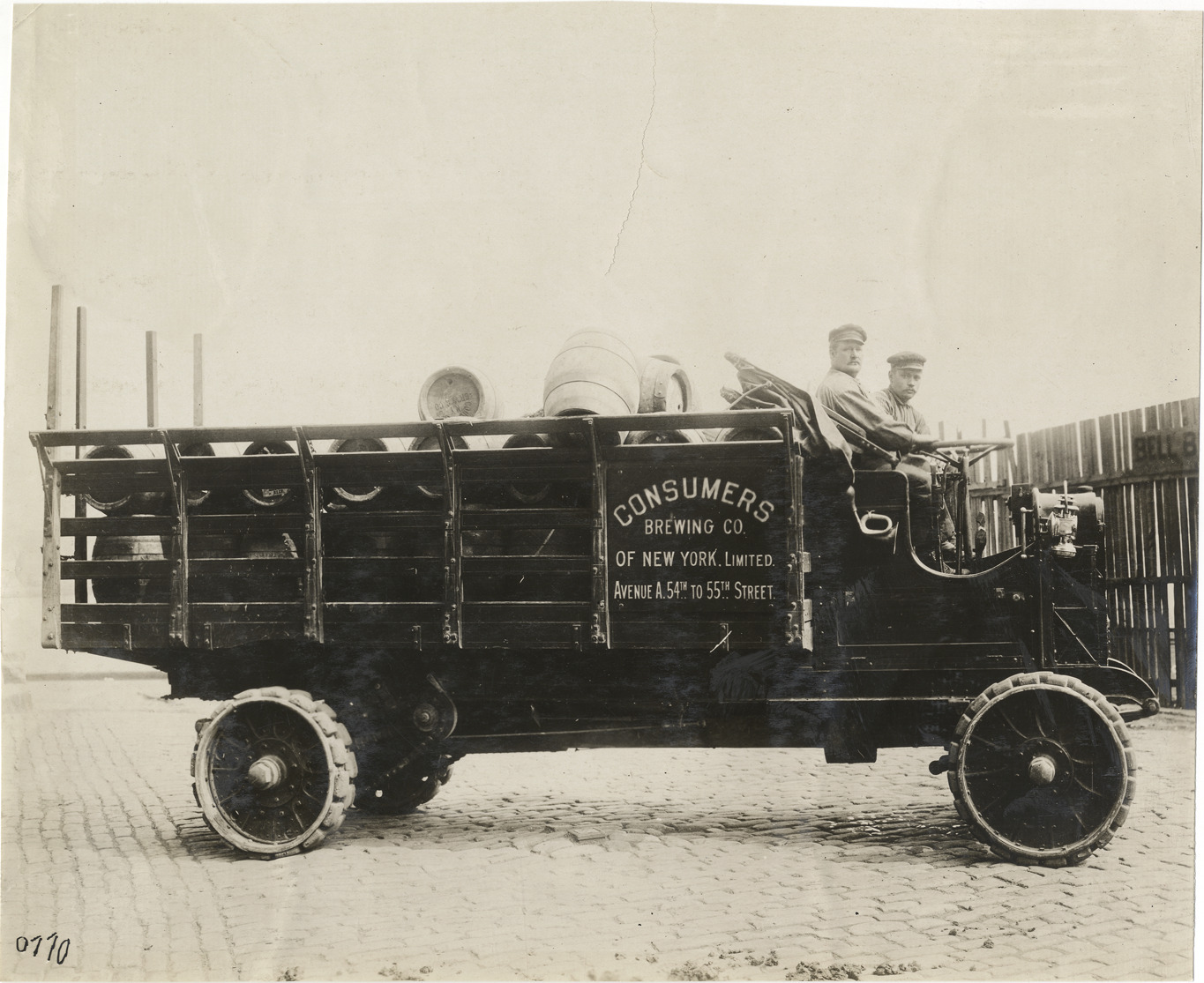 View of driver and passenger in 1910 Rapid truck owned by Consumers Brewing Company. "Consumers Brewing Co. of New York, Limited. Avenue A, 54th to 55th Street" painted on truck. Handwritten on back: "Motor trucks--Rapid, 1910."