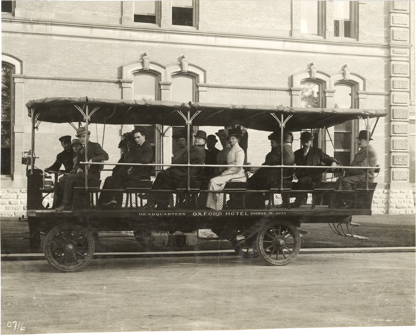 Favorite this☆ Passengers in Rapid bus, Oxford Hotel Description: View of passengers in 1910 Rapid bus owned by the Oxford Hotel. "Headquarters, Oxford Hotel, phone M. 5625" painted on side of bus. Handwritten on back: "Motor trucks--Rapid, 1910." Details Resource ID: na009589 Subject: Buses Rapid Motor Vehicle Company Photographic prints Date Issued: Unknown year Format: 1 photographic print ; 7.5 x 9.25 in. Member of: National Automotive History Collection Lazarnick Collection Filing Location: Motor trucks--Rapid #4 Rights: Physical rights are retained by DPL. Copyright is retained in accordance with U.S. copyright laws.