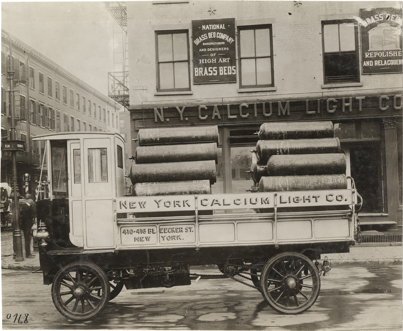 View of 1910 Rapid truck owned by New York Calcium Light Company. Truck carries load of tanks. "New York Calcium Light Co., 410-416 Bleecker St., New York" painted on side of truck; "National Brass Bed Company, manufacturers and designers of high art brass beds" sign on N.Y. Calcium Light Co. building in background. Handwritten on back: "Motor trucks--Rapid, 1910."