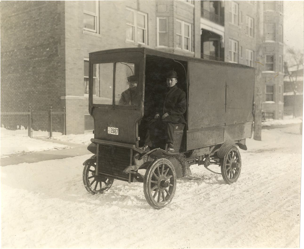 View of driver and passenger in 1910 Rapid truck. Stamped on back: "Spooner & Wells, Inc., photographers, telephone North 1745. 1231 Woodward Ave., Detroit, Mich. Detroit, 1231 Woodward, New York, 1931 Broadway." Handwritten on back: "Motor trucks--Rapid, 1910."
